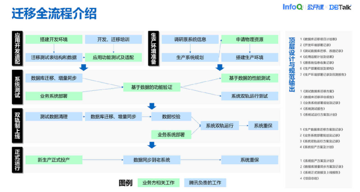上图是我们迁移的全流程介绍,这里 Oracle 和 TDSQL 两个数据库同时跑,系统双轨运行,给业务一个选择。最后是正式运行,数据同步到老系统,从 TDSQL 同步到 Oracle 这个需要用户决定,我们可以支持把这个数据同步过去。