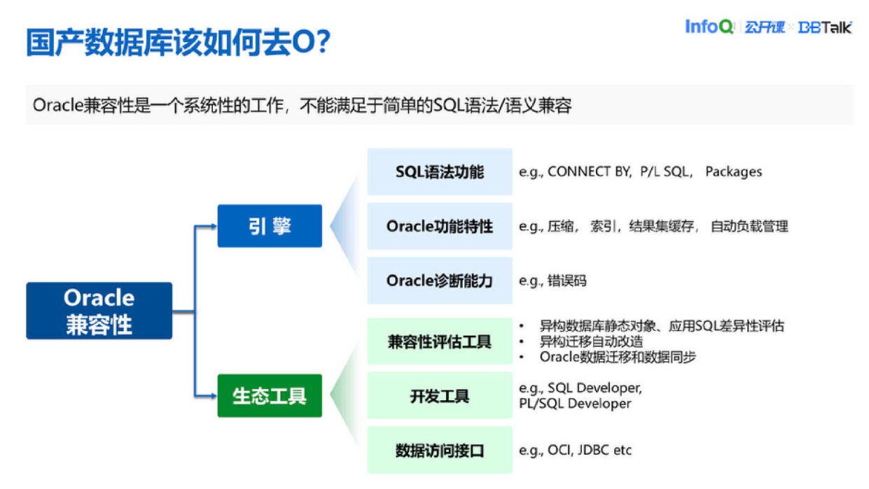 目前 Oracle 在国内市场占比较大,所以我们认为去 O 应该是国产数据库发展的一条道路。去 O 是一个系统性工作,不是简单满足于某一个 SQL 语法兼容或者语义兼容就完成的。从上图可以看到,Oracle 兼容是从引擎和生态工具两方面考虑的。引擎就是数据库内核,有 SQL 语法功能上的兼容,比如说支持层次查询、Packages;还有一些 Oracle 功能相关的,像全局索引、结果集缓存、自动负载,这些我们都会考虑做兼容,因为它跟性能、维护性都联系紧密。还有诊断能力,因为用户会根据 Oracle 的一些数据库反馈错误码去做不同的错误处理,这一块也是我们需要考虑的兼容点。