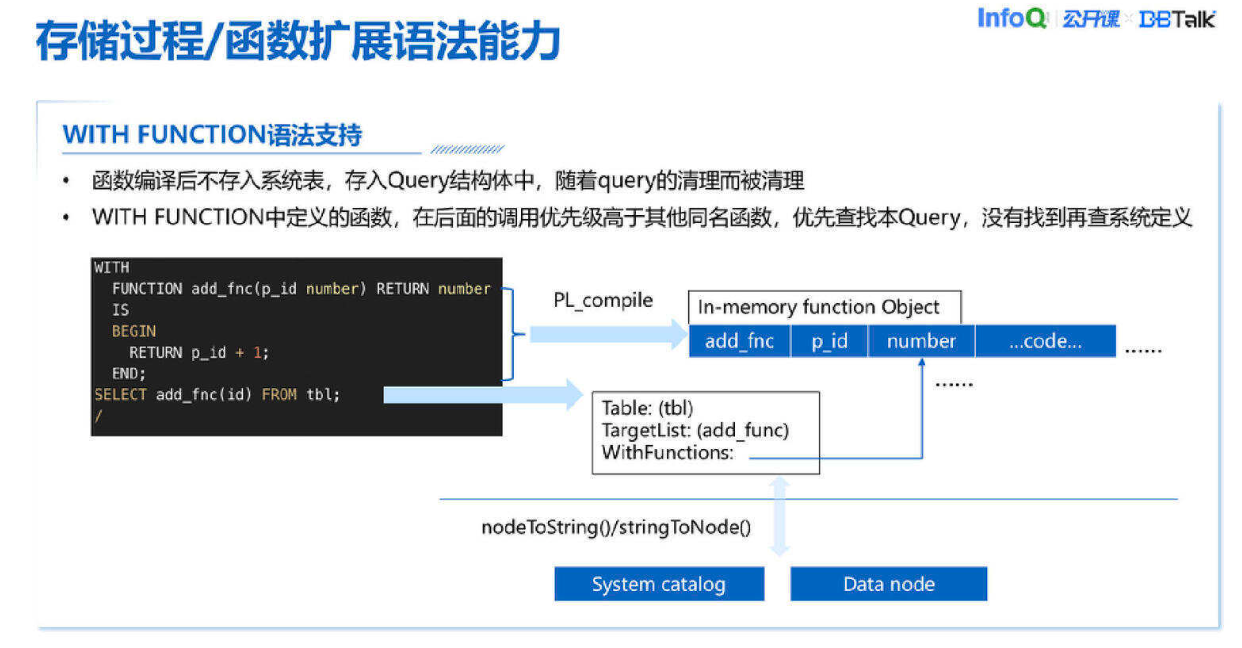 WITH FUNCTION 里还有一个用法,像上图左边黑框里的语句如果是 create view 的一部分,因为 view 也是被编译好放到系统表里,所以我们把 WITH FUNCTION 放到 Query 里,实际上 view 把 Query 序列化,这样 WITH FUNCTION 内存对象就可以随着 Query 一起序列化,并存放到系统表里,所以说这样的话 create view 也会顺利支持 with function。
