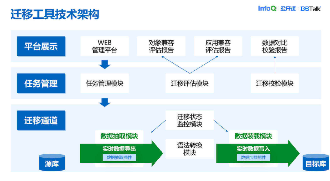 以上是我们迁移工具的技术构架。迁移工具会从源库把数据抽取出来,通过数据装载模块把数据写入到目标库中,在这个过程中我们会有一些语法转换,比如说 DDL 语法转化或者其他一些对象类型的语法转换,这些对象也会写入到目标库中。