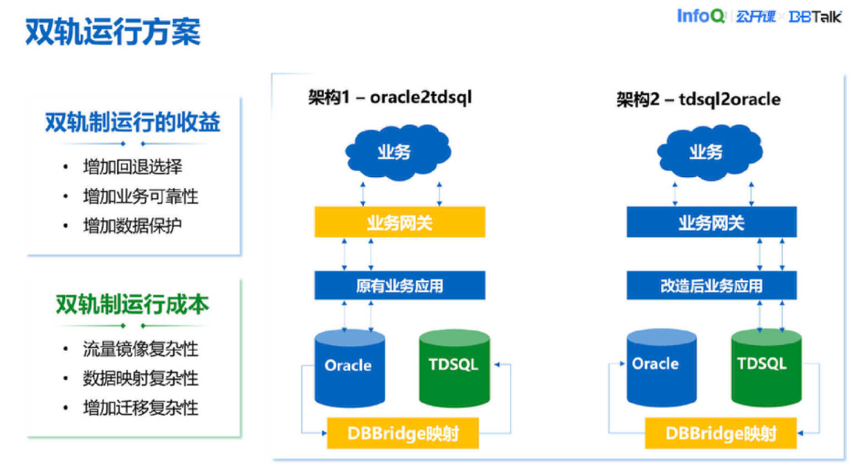 上图就是双轨运行方案,意思是说迁移完之后 Oracle 和 TDSQL 是两套数据库同时运行,业务可以通过开关把相应的流量指向到 Oracle 或 TDSQL。比如说有业务流到 TDSQL,数据可以从 TDSQL 反向同步到 Oracle,Oracle 的数据也可以反向同步到 TDSQL,这样两套系统同时运行,增加业务可靠性,给用户可以回退的选择。这样可能会增加运行成本,比如说镜像流量比较复杂,数据映射也可能会复杂一些,并且需要数据同步。