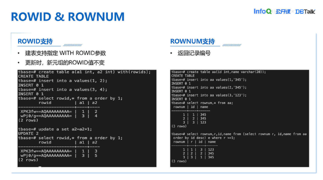 上图是 ROWID 和 ROWNUM。ROWID 表示元组物理位置,元组生成完之后它的物理位置或者 ROWID 是不变的。而 TDSQL 中,元组生成后一旦被更新,新元组就会挪到那个位置,它的物理位置其实是变化的。针对这个问题我们做了另一种方式去兼容 ROWID 特性,比如说在每个表创立的时候都会为这个表指定一个序列,ROWID 是由这个序列号组成的,通过这种方式可以完成一个兼容特性,就是更新的时候 ROWID 不变。ROWNUM 对返回记录编号,就像上图下面这个例子。比如说我写一个查询,select ROWNUM from A,它的第一条记录的 ROWNUM 就表示为 1,每出一条记录都会有一个编号。JOIN 也是一样,页面优化器会把查询里所有跟表相关的一些列都下推到下层跟这个表最近的算子上面去执行,所以 ROWNUM 可以认为它不是跟任何表相关的,它是最后去计算的,通过这种方式我们就可以把每条元组进行编号。