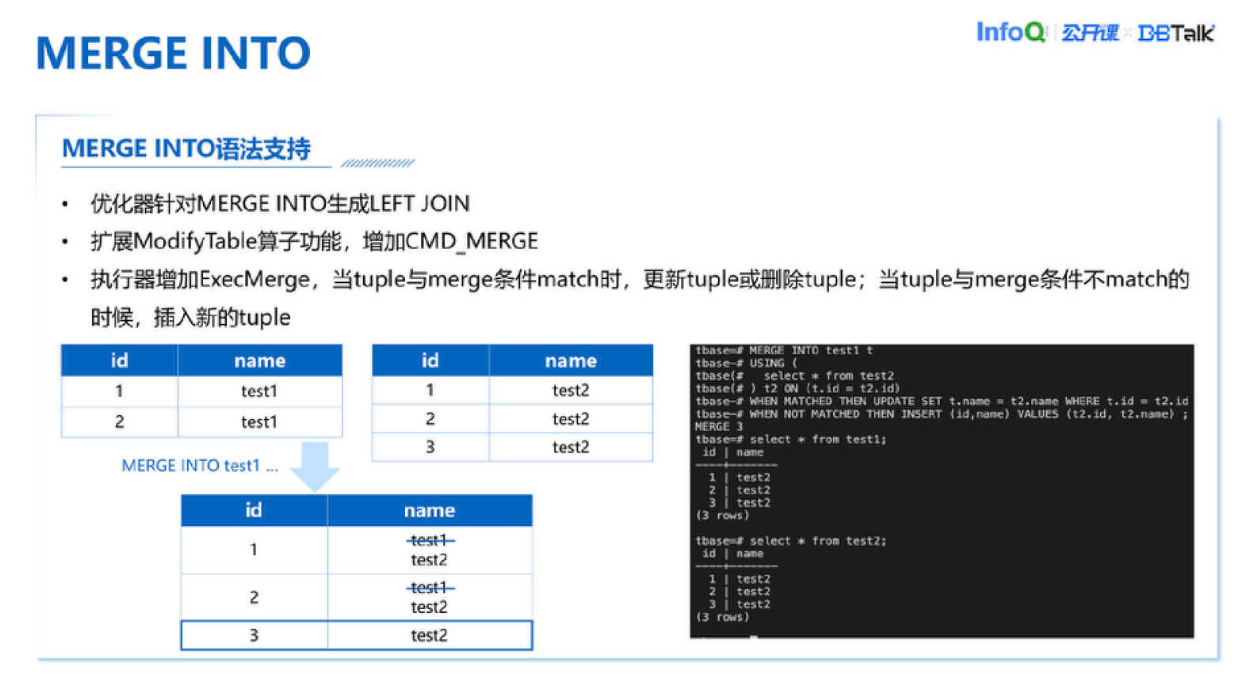 MERGE INTO 就是把一个表的数据 MERGE 到另一个表里。我们把 MERGE INTO 实现成一个 LEFT JOIN,就像上图这个例子,MERGE INTO T1 USING 子查询,或者一个表,然后 ON 一个条件。USING 可以认为是一个 source,INTO 是一个目标表,生成这个 LEFT JOIN 就是 source 和 target 表的 join,因为 source 表都要被处理,所以会生成这么一个执行计划。在这里面我们扩充了一个 Modify Table 算子功能,因为之前 Modify Table 是处理 insert、update、delete,就没有 MERGE 功能,所以我们增加一个 CMD MERGE 功能对它扩充。增加 MERGE 之后它会根据 tuple 是否跟 merge 条件 match 选择更新或者删除 tuple。match 的时候更新或删除,不 match 的时候会插入。