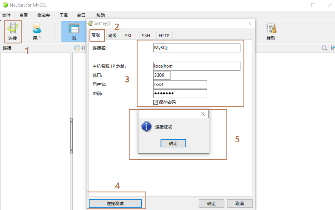 新建连接,输入链接名称、主机名或 IP 地址、端口号,用户名和密码,连接测试,成功如下图: