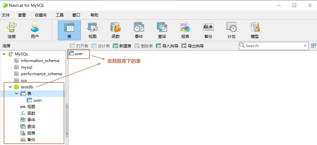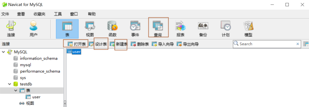 我们经常使用的功能有:打开表,设计表,新建表,查询等,如下图: