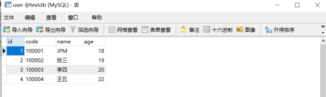 打开 user 表:选中 user 表,双击打开或者点击打开表打开,可以查看该表的数据,如下图: