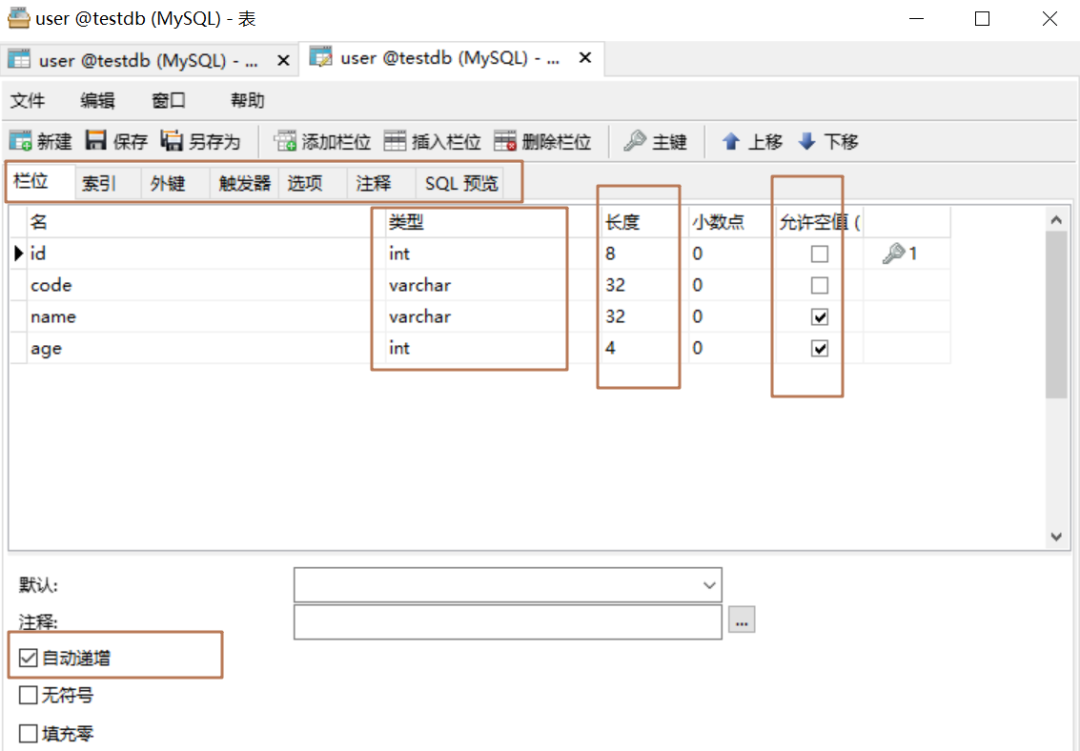 设计 user 表:选中 user 表,右键设计表或者点击工具栏的设计表,可以修改该表的数据结果,如下图: