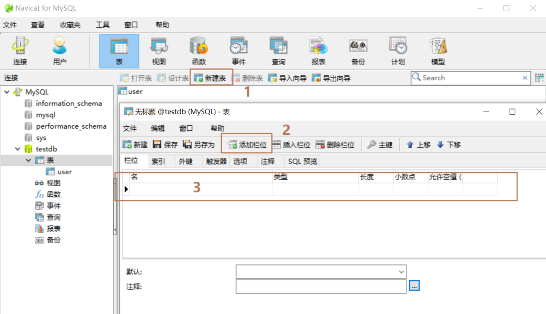 新建表:右键新建表或者点击工具栏的新建表表,可以新建一个表,如下图:
