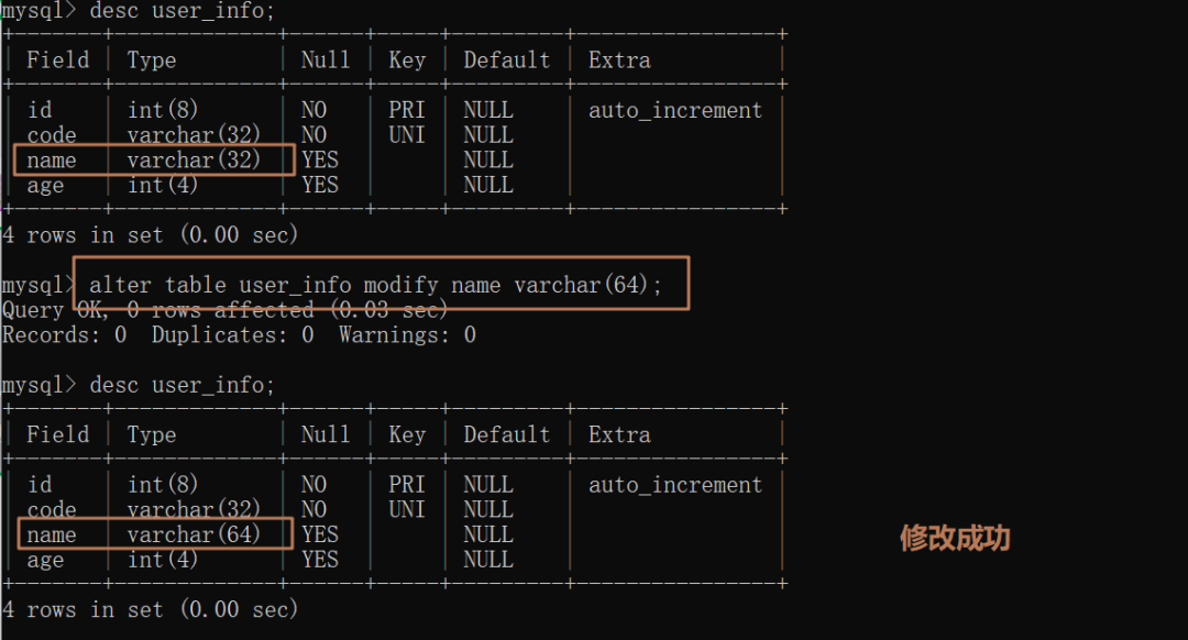 语法:alter table 表名 modify 字段名 字段类型;--把user_info表的name字段的数据类型调整为varchar(64)alter table user_info modify name varchar(64);