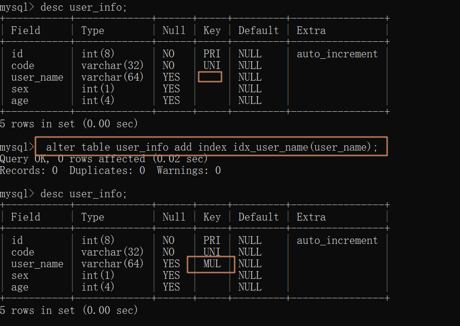 mysql> show tables;+------------------+| Tables_in_testdb |+------------------+| user |+------------------+1 row in set (0.00 sec)mysql> desc user;+-------+-------------+------+-----+---------+----------------+| Field | Type | Null | Key | Default | Extra |+-------+-------------+------+-----+---------+----------------+| id | int(8) | NO | PRI | NULL | auto_increment || code | varchar(32) | NO | UNI | NULL | || name | varchar(32) | YES | | NULL | || age | int(4) | YES | | NULL | |+-------+-------------+------+-----+---------+----------------+4 rows in set (0.00 sec)