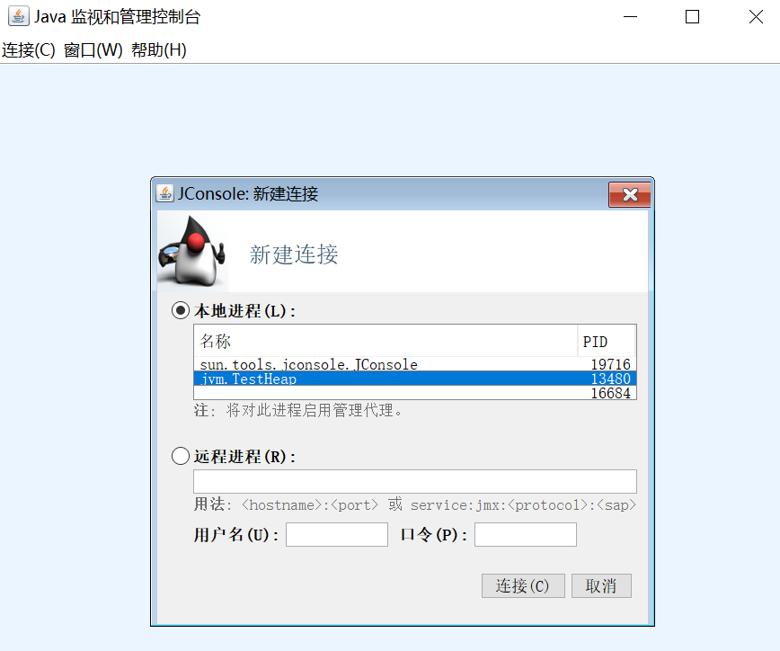 cmd 里输入 jconsole,或者 jdk/bin 目录下点击 jconsole.exe 打开 jconsole 工具,如下图: