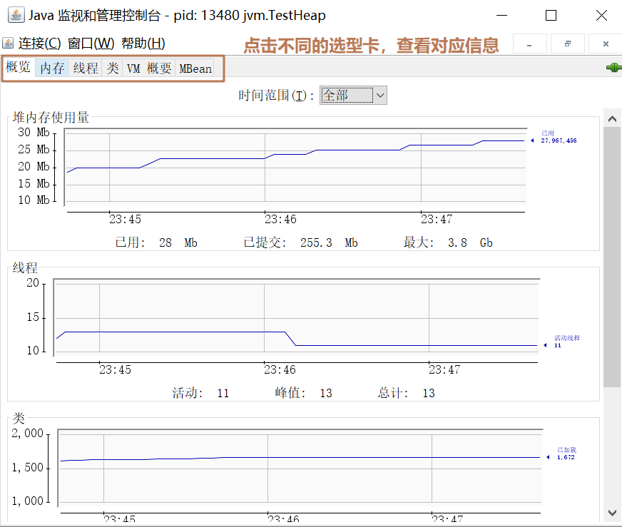 查看 java 应用程序的运行概览、监控堆信息,可以监控Java应用程序的内存使用情况、线程状态、CPU占用率等。