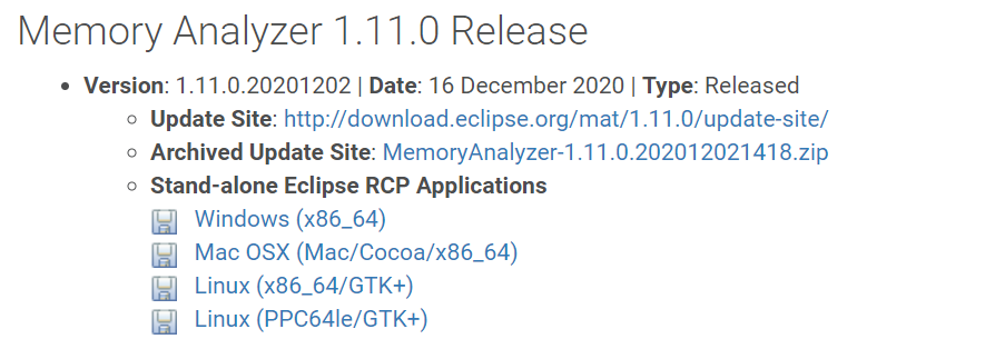 Eclipse 的 MAT 插件 MemoryAnalyzer 用于分析堆内存泄漏,下载地址:https://www.eclipse.org/mat/downloads.php。