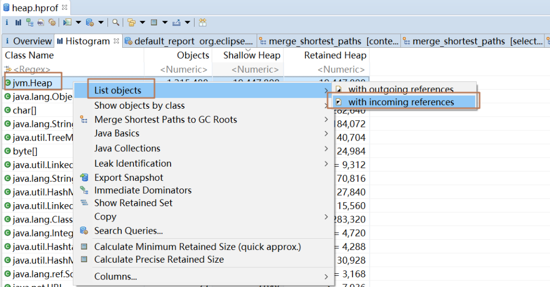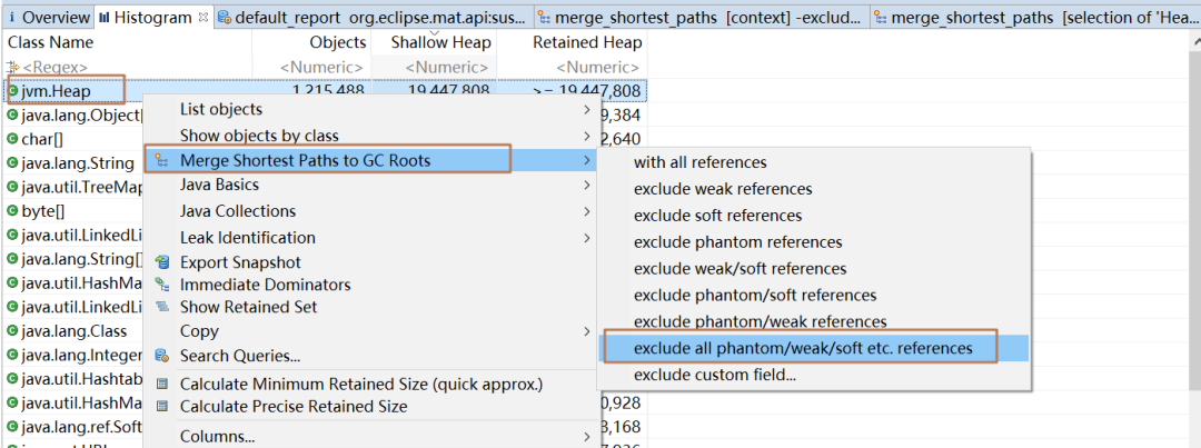 在类名上右键--->Merge Shortest Paths to GC Roots--->exclude all phantom/weak/soft etc.references 可以看到 GC Root 以及没有垃圾回收的原因,如下: