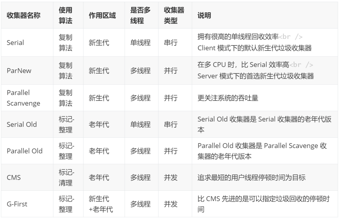 新生代收集器有:Serial、ParNew、Parallel Scavenge,老年代收集器有:Serial Old、Parallel Old、CMS,G-First 适用于新生代和老年代。
