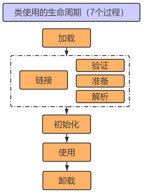 类从被加载到虚拟机内存中开始直到卸载出内存为止,它的整个生命周期包括 7 个阶段:加载、验证、准备、解析、初始化、使用和卸载。类加载主要是前 5 个阶段。