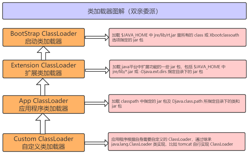 检查某个类是否已经加载的顺序是自底向上,从Custom ClassLoader 到 BootStrap ClassLoader 逐层检查,只要某个 Classloader 已加载,就视为已加载此类,保证此类只加载一次;类加载的顺序是自顶向下,也就是从上到下,由上层来逐层尝试加载类。