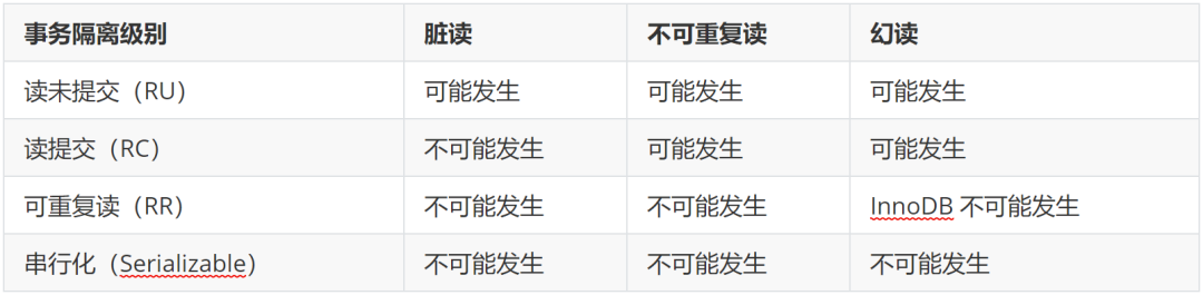 在 MySQL InnoDB 存储引擎里,不需要使用串行化的隔离级别去解决所有问题,下面我们来通过一张表格来看一下 InnoDB 对数据库事务隔离级别的支持情况:
