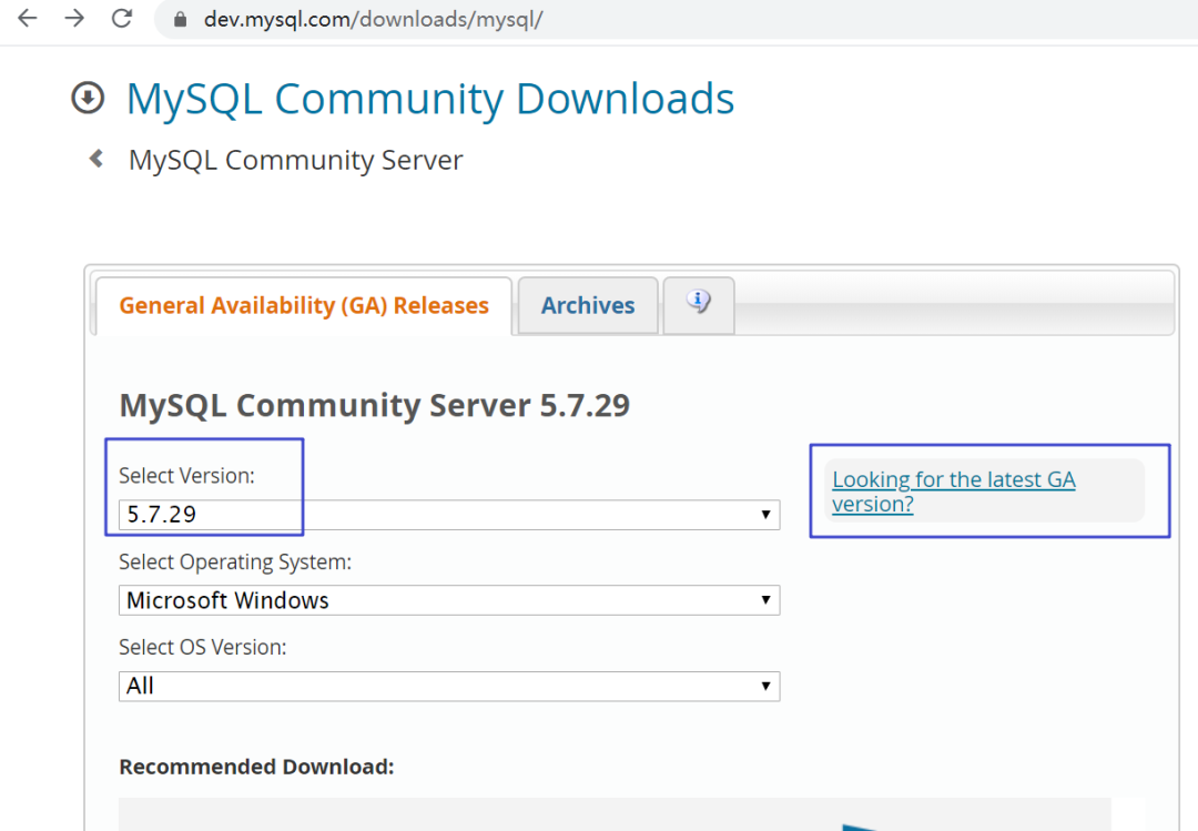 打开后点击:MySQL Community Server ,点击 Looking for previous GA versions? 选择 MySQL 的历史通用版本。