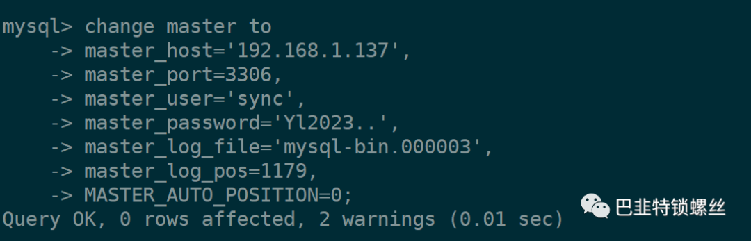 change master tomaster_host='192.168.1.137',master_port=3306,master_user='sync',master_password='Yl2023..',master_log_file='mysql-bin.000003',master_log_pos=1179,MASTER_AUTO_POSITION=0;