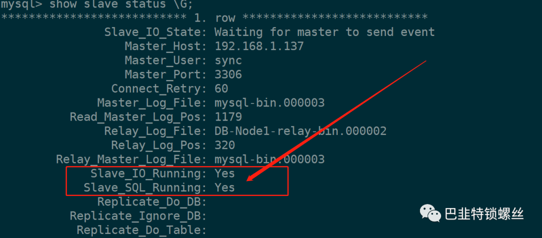 mysql> show slave status \G;*************************** 1. row ***************************Slave_IO_State: Waiting for master to send eventMaster_Host: 192.168.1.137Master_User: syncMaster_Port: 3306Connect_Retry: 60Master_Log_File: mysql-bin.000003Read_Master_Log_Pos: 1179Relay_Log_File: DB-Node1-relay-bin.000002Relay_Log_Pos: 320Relay_Master_Log_File: mysql-bin.000003Slave_IO_Running: YesSlave_SQL_Running: YesReplicate_Do_DB:Replicate_Ignore_DB:Replicate_Do_Table:Replicate_Ignore_Table:Replicate_Wild_Do_Table:Replicate_Wild_Ignore_Table:Last_Errno: 0Last_Error:Skip_Counter: 0Exec_Master_Log_Pos: 1179Relay_Log_Space: 530Until_Condition: NoneUntil_Log_File:Until_Log_Pos: 0Master_SSL_Allowed: NoMaster_SSL_CA_File:Master_SSL_CA_Path:Master_SSL_Cert:Master_SSL_Cipher:Master_SSL_Key:Seconds_Behind_Master: 0Master_SSL_Verify_Server_Cert: NoLast_IO_Errno: 0Last_IO_Error:Last_SQL_Errno: 0Last_SQL_Error:Replicate_Ignore_Server_Ids:Master_Server_Id: 137Master_UUID: 4442baa3-a073-11ee-bea9-000c29b1eab0Master_Info_File: /var/lib/mysql/master.infoSQL_Delay: 0SQL_Remaining_Delay: NULLSlave_SQL_Running_State: Slave has read all relay log; waiting for more updatesMaster_Retry_Count: 86400Master_Bind:Last_IO_Error_Timestamp:Last_SQL_Error_Timestamp:Master_SSL_Crl:Master_SSL_Crlpath:Retrieved_Gtid_Set:Executed_Gtid_Set:Auto_Position: 0Replicate_Rewrite_DB:Channel_Name:Master_TLS_Version:1 row in set (0.00 sec)