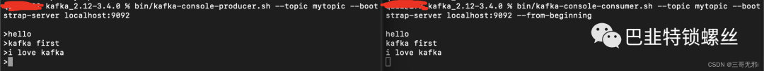 两个终端消息就可以联动,从 producer 终端生成消息,consumer 终端消费消息。