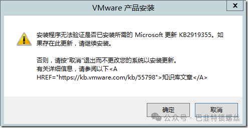 VMware Workstation pro 15在 win server 2012 R2环境下安装VMware Tools时提示“安装程序无法验证是否已安装所需的Microsoft更新KB2919355。如果存在此更新,请继续安装。”如下图所示,