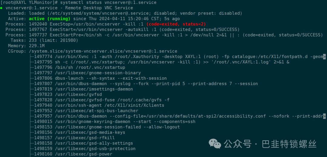 [root@XAYL YLMonitor]# vncserverWARNING: vncserver has been replaced by a systemd unit and is now considered deprecated and removed in upstream.Please read usr/share/doc/tigervnc/HOWTO.md for more information.New 'XAYL:1 (root)' desktop is XAYL:1Starting applications specified in root/.vnc/xstartupLog file is root/.vnc/XAYL:1.log