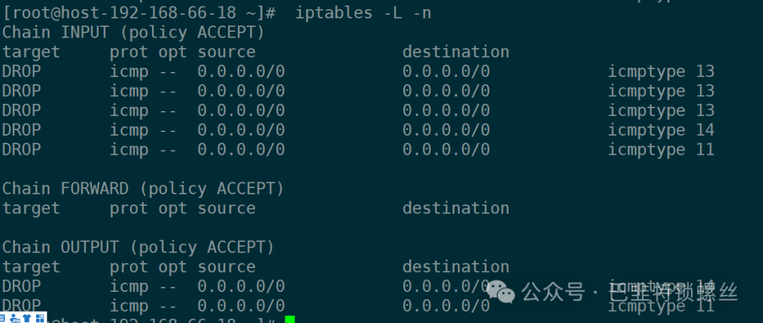 DROP icmp -- 0.0.0.0/0 0.0.0.0/0 icmp type 13DROP icmp -- 0.0.0.0/0 0.0.0.0/0 icmp type 14DROP icmp -- 0.0.0.0/0 0.0.0.0/0 icmp type 11Chain OUTPUT (policy ACCEPT)target prot opt source destinationDROP icmp -- 0.0.0.0/0 0.0.0.0/0 icmp type 11