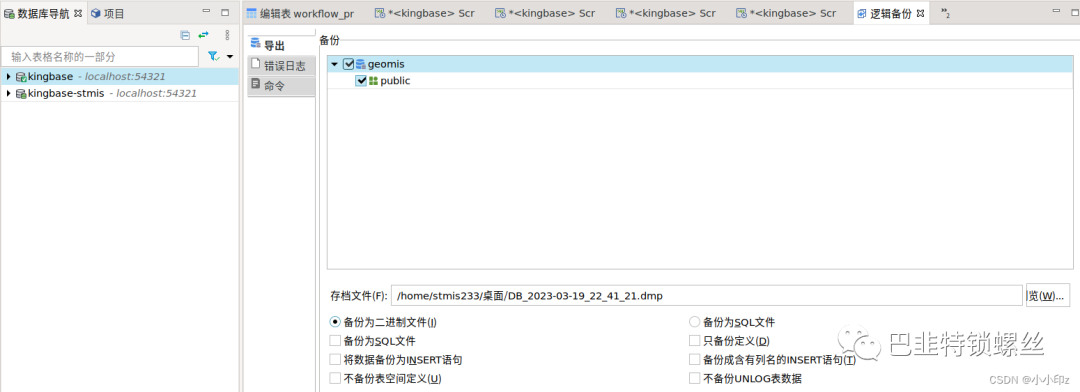 /home/kingbase/KingbaseES/V8/KESRealPro/V008R006C006B0013/ClientTools/bin/sys_dump -h localhost -p 54321 -U stmis -v -f "${BACKUP_FILE}" -F c geomis