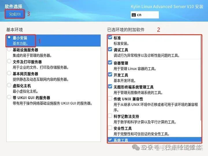 点击【软件选择】-【最小安装】-【标准、调试工具、容器管理、开发工具、无图形终端系统管理工具、系统工具】-【完成】进行配置软件选择