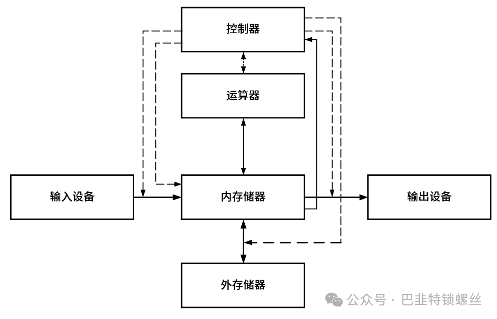 计算机各功能部件之间的合作关系如下图所示。