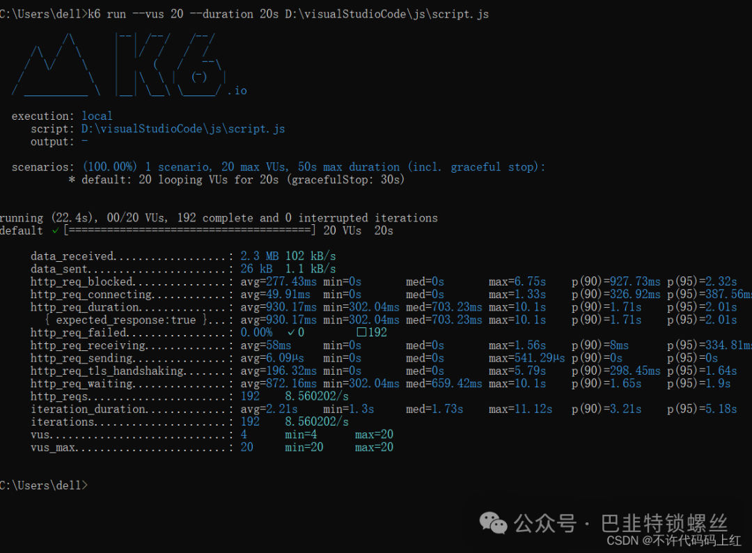 k6 run --vus 20 --duration 20s D:\visualStudioCode\js\script.js