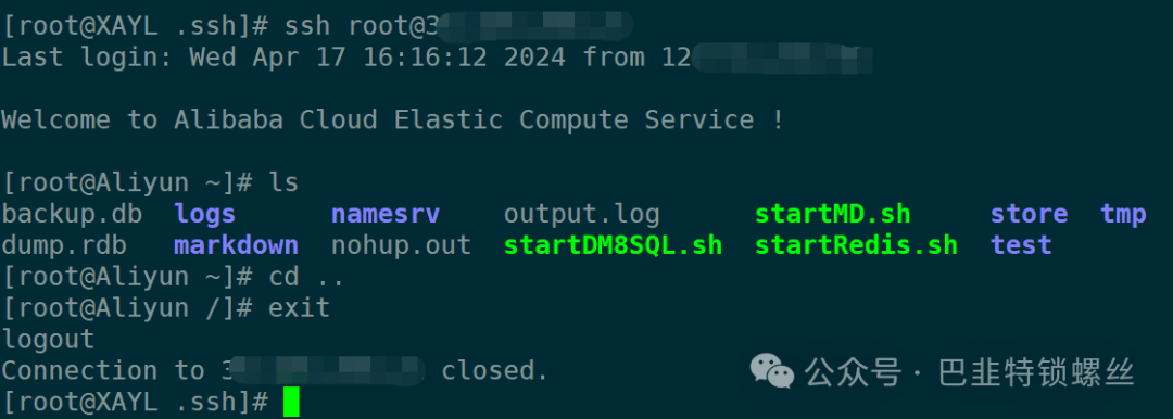 [root@XAYL .ssh]# ssh root@39.x.x.21Last login: Wed Apr 17 16:16:12 2024 from 122.51.215.96Welcome to Alibaba Cloud Elastic Compute Service ![root@Aliyun ~]# lsbackup.db logs namesrv output.log startMD.sh store tmpdump.rdb markdown nohup.out startDM8SQL.sh startRedis.sh test[root@Aliyun ~]# cd ..[root@Aliyun /]# exitlogoutConnection to 39.x.x.21 closed.