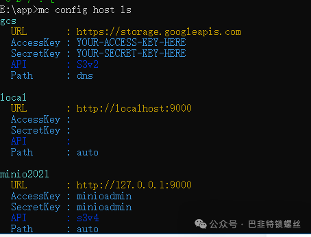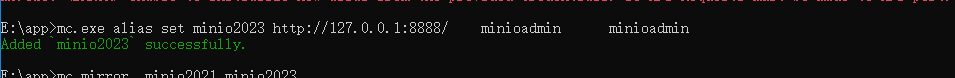 mc.exe alias set minio2021 http://127.0.0.1:9000/ minioadmin minioadminmc.exe alias set minio2023 http://127.0.0.1:8888 minioadmin minioadmin