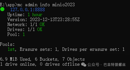 E:\app\2023>minio.exe server E:\app\2023 --address :8888 --console-address :6666Formatting 1st pool, 1 set(s), 1 drives per set.WARNING: Host local has more than 0 drives of set. A host failure will result in data becoming unavailable.WARNING: Detected default credentials 'minioadmin:minioadmin', we recommend that you change these values with 'MINIO_ROOT_USER' and 'MINIO_ROOT_PASSWORD' environment variablesMinIO Object Storage ServerCopyright: 2015-2023 MinIO, Inc.License: GNU AGPLv3 <https://www.gnu.org/licenses/agpl-3.0.html>Version: RELEASE.2023-12-13T23-28-55Z (go1.21.5 windows/amd64)Status: 1 Online, 0 Offline.S3-API: http://192.168.3.13:8888 http://192.168.1.1:8888 http://192.168.37.1:8888 http://127.0.0.1:8888RootUser: minioadminRootPass: minioadminConsole: http://192.168.3.13:6666 http://192.168.1.1:6666 http://192.168.37.1:6666 http://127.0.0.1:6666RootUser: minioadminRootPass: minioadminCommand-line: https://min.io/docs/minio/linux/reference/minio-mc.html#quickstart$ mc alias set 'myminio' 'http://192.168.3.13:8888' 'minioadmin' 'minioadmin'Documentation: https://min.io/docs/minio/linux/index.htmlWarning: The standard parity is set to 0. This can lead to data loss.+--------------------------------------------------------------------------------------+| You are running an older version of MinIO released 1 month before the latest release || Update: Run `mc admin update` |+--------------------------------------------------------------------------------------+
