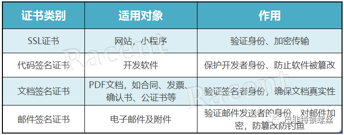 版权声明:本文内容始发于锐成信息>作者: May,遵循CC 4.0 BY-SA版权协议,转载请附上原文出处链接及本声明。本作品采用知识共享署名-非商业性使用-禁止演绎 2.5 中国大陆许可协议进行可。始发链接:https://www.racent.com/blog/differences-between-ssl-cert-and-other-digital-certificates在此特别鸣谢原作者的创作。此篇文章的所有版权归原作者所有,商业转载建议请联系原作者,非商业转载请注明出处