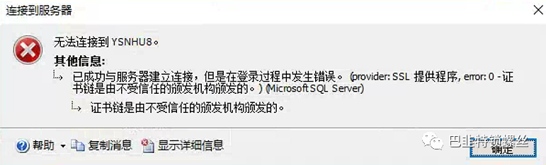 这个错误提示表明您无法连接到SQL Server,因为证书链中的颁发机构不受信任。这可能是由于您的计算机上缺少相应的根证书或证书链不完整导致的。