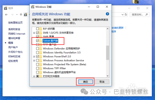 在windows功能列表中,勾选“Telnet客户端”,点击“确定”。