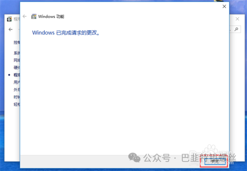 等待Telnet客户端功能安装完毕,点击“关闭”,即启用了Telnet客户端功能。