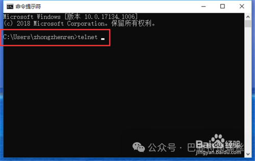 2、在命令提示符窗口,输入telnet ,按回车键,进入telnet命令。