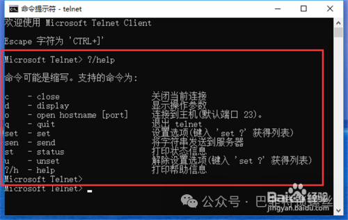 3、进入telnet命令后,可以输入相应的命令执行操作。输入 ?/help ,按回车键,查阅Telnet的所有命令及用法。