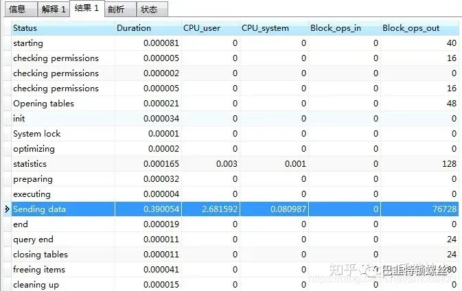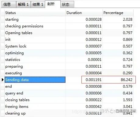 可以分析出这条语句,86%的时间是花在了Sending data(所谓的“Sending data”并不是单纯的发送数据,而是包括“收集 [检索] + 发送数据”):