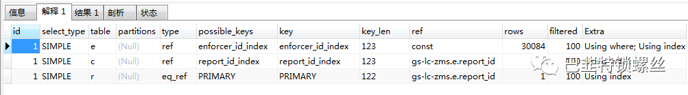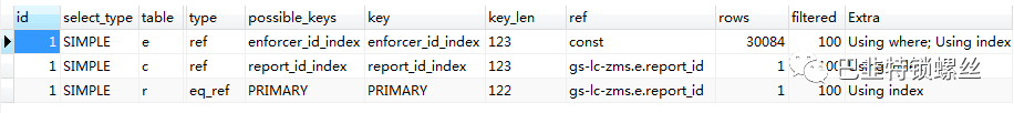 通过Explain解释也能看出索引已经加了(enforcer_id_index),而且通过索引几乎全表检索了30084条数据,如下: