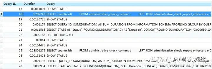 通过show profiles我们可以看到我们上面执行的那条SQL(Query_ID=18,为了确保监视最新的数据,Query_ID最好取25):