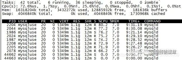 很明显是前面两个mysqld进程导致整体负载较高。而且,从 Cpu(s) 这行的统计结果也能看的出来,%us 和 %wa 的值较高,表示当前比较大的瓶颈可能是在用户进程消耗的CPU以及磁盘I/O等待上。