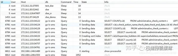 | 26 |root| 172.16.1.133:45923 | db | Query | 65 | Sending data | select max(Fvideoid) from (select Fvideoid from t where Fvideoid>484915 order by Fvideoid) t1 |