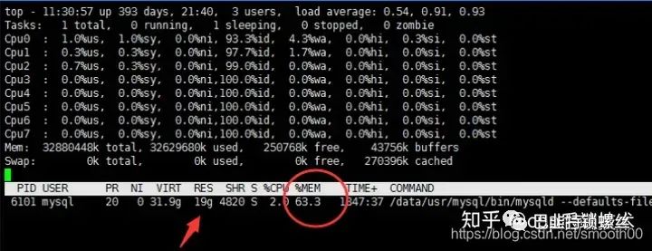 (1)首先分析内存也可以用万能的TOP命令,看看是否mysql进程占用内存高 :