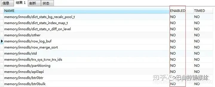 按理用mysql查询命令,就能查到当前各项内存或缓存的使用情况,但是mysql默认是没有开启内存监控的,通过以下语句就能查出大部分监控项都是未开启的: