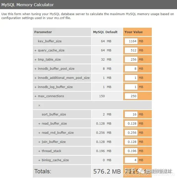 对于内存使用预估,在网上有人推荐了一款内存计算器,统计网址:http://www.mysqlcalculator.com/